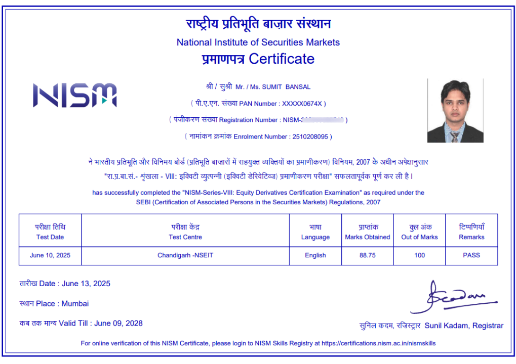 Sumit Sir is one of the best and most genuine teachers for learning option selling in the stock market. His option selling strategies are powerful and work effectively in all types of market conditions. The hedging techniques he teaches are especially strong and help manage risk very well. He provides perfect entry and exit points for every trade, whether it's for short-term or long-term. His constant guidance and support on every trading and investment idea are truly invaluable. Thank you and God bless you, Sumit Sir.